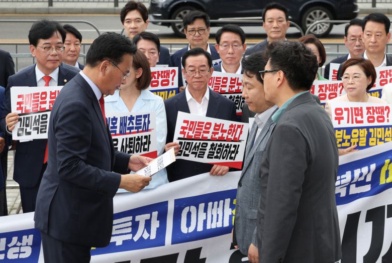 유상범 국민의힘 의원이 1일 용산 대통령실 앞에서 현장 의원총회를 마친 뒤 이광수 대통령실 정무수석실 선임행정관과 오경환 행정관에게 김민석 국무총리 후보자 지명 철회를 요구하는 서한을 전달하고 있다. 연합뉴스 |