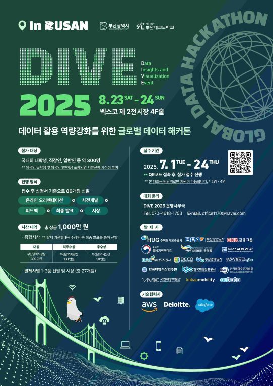 부산테크노파크가 부산시와 오는 8월23∼24일 벡스코 제2전시장에서 글로벌 데이터 해커톤 대회 'DIVE 2025'를 개최한다고 1일 밝혔다.