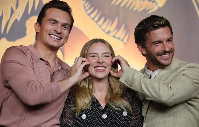 루퍼트 프렌드·스칼렛 요한슨·조나단 베일리(왼쪽부터 차례로)가 '쥬라기 월드: 새로운 시작'의 내한 기자간담회에 참석했다. 뉴스1 |