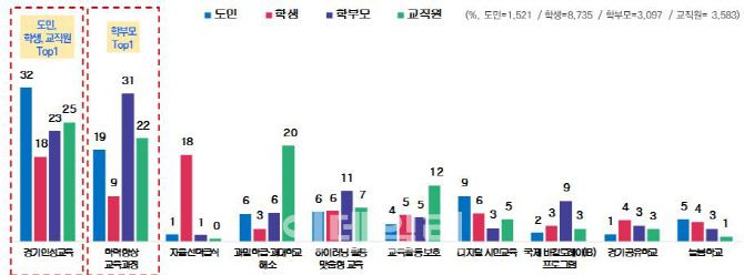 학생 역시 경기인성교육(18%)을 1순위로 꼽았으며, 자율선택급식(18%, 학력 향상 교육과정(9%) 등이 뒤를 이었다. 교직원 1순위는 경기인성교육(25%), 2순위 학력향상 교육과정(22%), 3순위 과밀학급·과대학교 해소(20%)로 집계됐다.