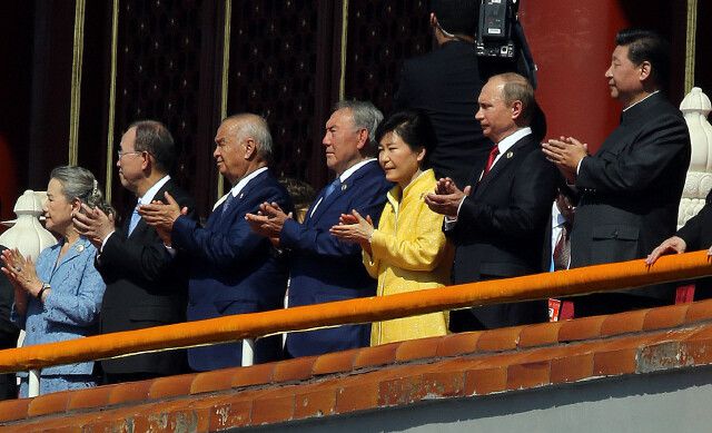 2015년 9월3일 베이징 천안문에서 열린 ‘항일전쟁 승리 70주년 기념 열병식’에 박근혜 당시 대통령이 시진핑(맨 오른쪽) 중국 국가주석, 블라디미르 푸틴(오른쪽에서 둘째) 러시아 대통령 등과 함께 참석하고 있다. 한겨레 자료사진