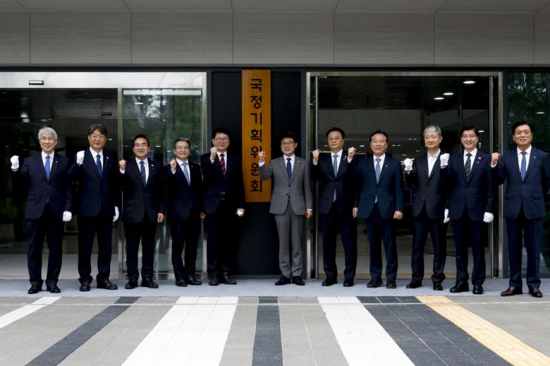 이재명 정부 대통령직인수위원회 역할을 할 국정기획위원회 출범식이 열린 지난달16일 서울 종로구 정부서울청사 창성동 별관에서 이한주 위원장과 김용범 대통령실 정책실장, 진성준 더불어민주당 정책위의장 등 참석자들이 현판식을 하고 있다. 문재원 기자 |