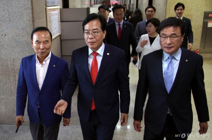 송언석 국민의힘 비상대책위원장 겸 원내대표가 1일 오후 서울 여의도 국회에서 열린 비공개 비대위회의에 참석하고 있다. 왼쪽부터 박덕흠 비대위원, 송언석 비대위원장, 김대식 비대위원. 2025.07.01. /사진=뉴시스 /사진=김금보 |