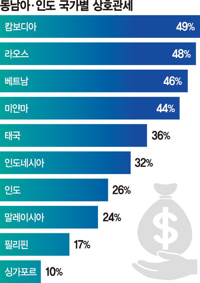 트럼프 대통령은 지난달 29일 공개된 폭스뉴스와의 인터뷰에서 전 세계 57국에 부과하기로 한 상호 관세를 더 이상 유예하지 않고 모든 국가에 관세율을 통보하는 서한을 보내겠다는 뜻을 밝힌 상태다. 만약 협상이 이뤄지지 못하면 당초 발표된 관세가 즉시 부여될 것이라 강조하고 있다. 이에따라 초기에 고관세율 직격탄을 맞은 베트남(46%), 태국(36%), 인도네시아(32%), 인도(26%) 등 아세안·인도 핵심국가들은 통상 수장을 워싱턴 D.C로 급파하는 등 운명의 한 주를 맞고 있다.
