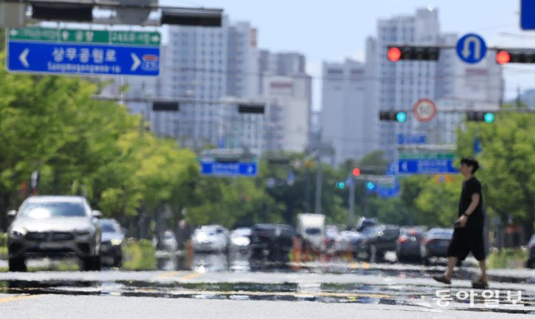 폭염에 이글거리는 도로- 추가 찜통더위가 계속되고 있는 1일 광주 서구 상무지구의 도로가 햇볕에 달궈지며 아지랭이가 피어오르고 있다. 광주=박영철 기자 skyblue@donga.com |