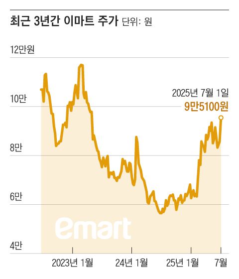 1일 여의도 증권가에서 가장 화제를 모은 종목은 단연 이마트였다. 이날 이마트 주가는 전날보다 11.4% 오른 9만5100원에 마감했다. 장중 한때 9만6000원까지 치솟으며 2년 만에 최고가를 경신했다.