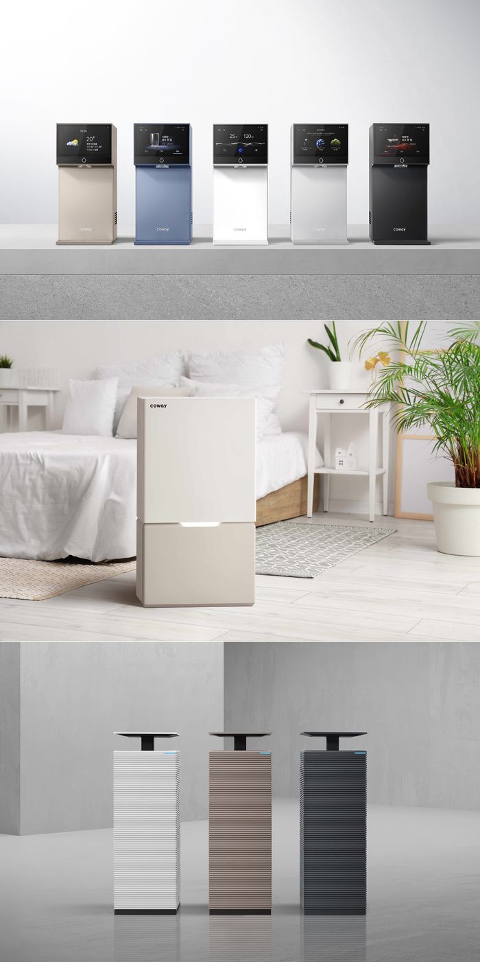 (위부터) 아이콘 프로 정수기, 인버터 제습기 23L, 노블 제습공기청정기. 사진 | 코웨이 |