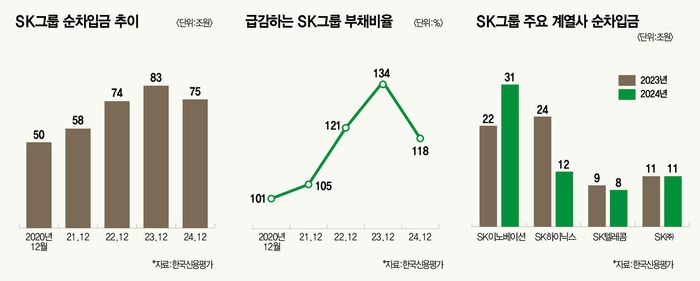 한국신용평가는 최근 SK그룹 사업 재편 방향에 대해 ‘중단기적으로 재무 구조 개선 추세가 지속될 것’이라는 내용의 신용분석 보고서를 발간했다. 보고서에 따르면 SK그룹 순차입금은 2023년 12월 말 83조원에서 지난해 말 75조원으로 8조원 줄었다. 같은 기간 부채비율도 134%에서 118%로 16%포인트 떨어졌다. 올 1분기 SK그룹 지주사 SK㈜ 순차입금이 추가로 2조4000억원 줄어든 점을 감안하면 그룹 전체적으로 10조원 안팎 차입금이 감소했다는 분석이다.