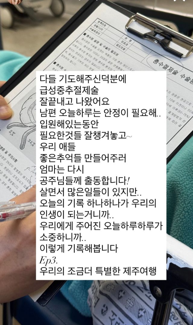이어 “오늘의 기록 하나하나가 우리의 인생이 되는 거니까… 우리에게 주어진 하루하루가 소중하니까”라며 “이렇게 기록해봅니다. Ep.3. 우리의 조금 더 특별한 제주여행”이라는 글을 덧붙였다. 평범한 가족 여행 중 뜻밖의 수술 상황, 그리고 이를 따뜻하게 기억하려는 부부의 시선이 돋보인다.