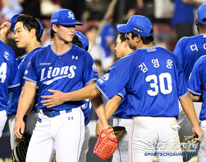1일 잠실야구장에서 열린 삼성과 두산의 경기, 삼성이 4대1로 승리했다. 9회말 2사 만루 위기에서 경기를 끝낸 삼성 이호성이 김영웅과 기쁨을 나누고 있다. 잠실=허상욱 기자wook@sportschosun.com/2025.07.01/