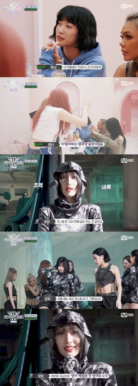 모모는 “언니랑 한 10년 만에 같이 추는 것 같다. 어릴 때는 같이 댄스팀 하고 그랬는데 이렇게 눈 마주칠 때마다 옛날 생각이 나기도 하고 10년 지났는데 합이 괜찮은 것 같다”라고 남다른 감회를 드러냈다.