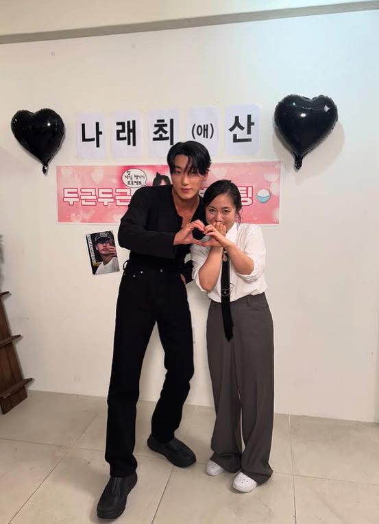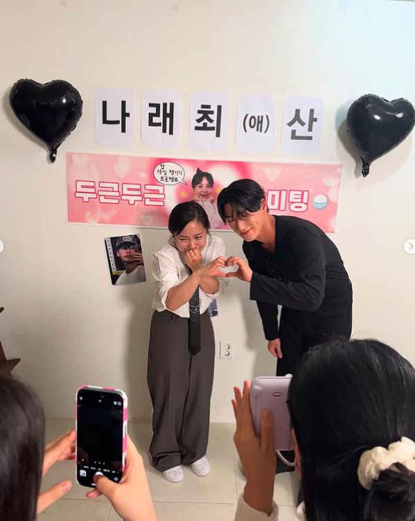 ‘나래 최(애) 산’이라는 문구가 적힌 현수막 아래에서 두 사람은 함께 손으로 하트를 만들고 있으며, 또 다른 사진에서는 박나래가 감격에 겨워 입을 가린 채 기쁨을 감추지 못하는 모습이 포착되어 보는 이들을 미소 짓게 한다.