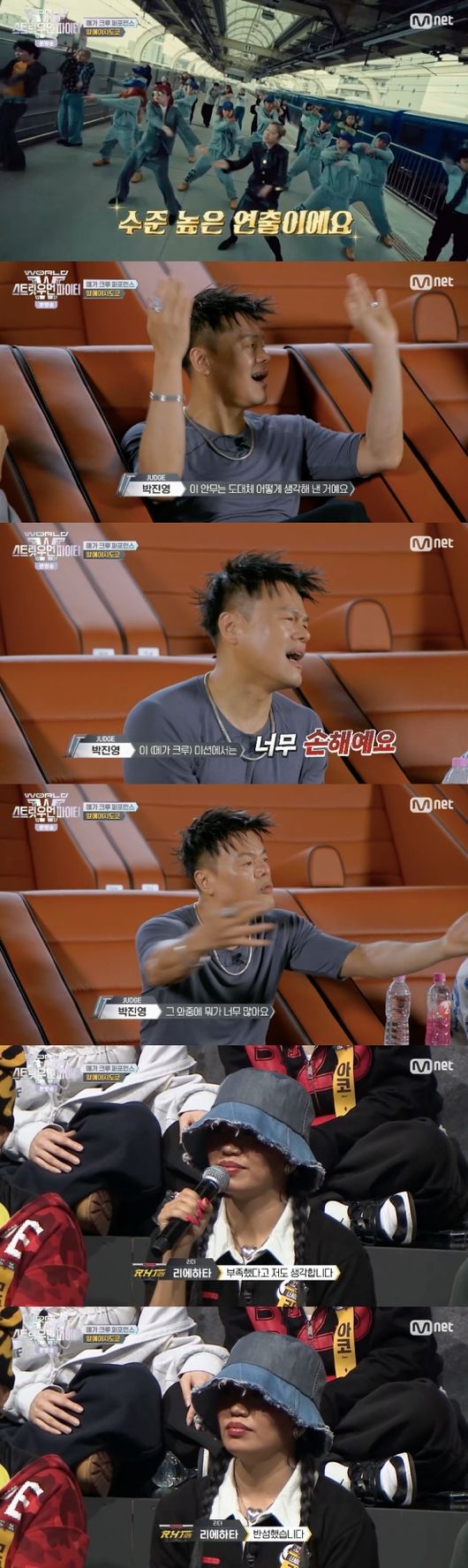 박진영은 공감하면서도 “이 미션에서는 너무 손해다. 춤이 보여야 하는데 그 와중에 뭐가 너무 많다. 시각적으로 압도적이어야 한다”라고 평했고, 리아킴은 “댄스 자체가 약했다. 완성도가 떨어지는 부분이 있었다”라고 아쉬워했다.