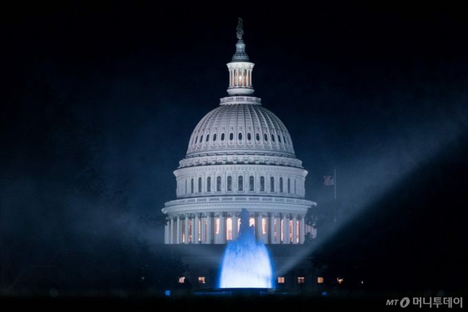 1일(현지시간) 새벽 미국 수도 워싱턴 DC에 위치한 의회 의사당에 환하게 불이 켜져 있다. 상원 공화당 지도부는 오는 4일 독립기념일 이전에 도널드 트럼프 대통령의 이른바 '하나의 크고 아름다운 법안'(메가법안)의 의회 통과를 목표로 마라톤 투표를 진행하고 있다. /워싱턴DC AFP=뉴스1