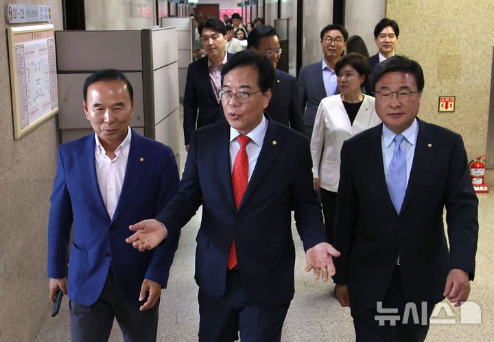 [서울=뉴시스] 김금보 기자 = 송언석 국민의힘 비상대책위원장 겸 원내대표가 1일 오후 서울 여의도 국회에서 열린 비공개 비대위회의에 참석하고 있다. 왼쪽부터 박덕흠 비대위원, 송언석 비대위원장, 김대식 비대위원. 2025.07.01. kgb@newsis.com |