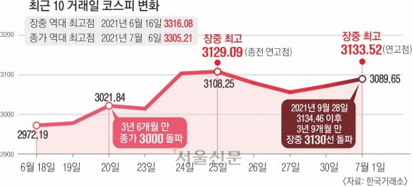 1일 코스피는 전 거래일 대비 0.58% 상승한 3089.65로 거래를 마쳤다. 장중 한때 3133.52까지 오르면서 지난달 25일(장중 최고 3129.09) 이후 4거래일 만에 연고점을 더 높였다. 코스피가 장중 3130선을 돌파한 건 2021년 9월 28일(장중 최고 3134.46) 이후 3년 9개월 만이다.