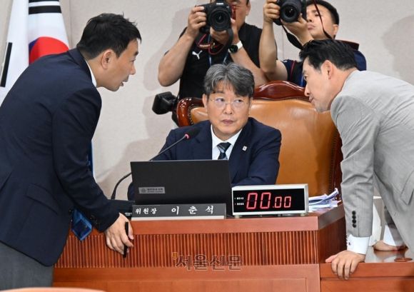 이춘석 국회 법제사법원회 위원장이 1일 서울 여의도 국회에서 열린 제426회국회(임시회) 제1차 전체회의에서 김용민 더불어민주당, 장동혁 국민의힘 간사와 대화하고 있다. 법사위는 이날 이사의 충실의무 대상 확대 등을 담은 상법 개정안을 법안심사소위에 회부했다. 안주영 전문기자 |