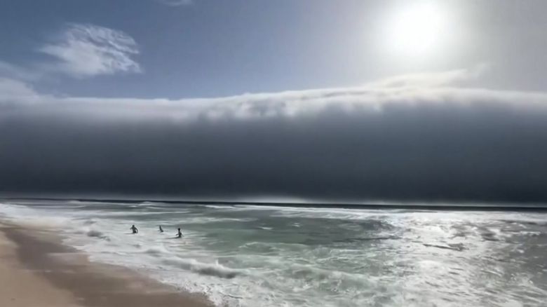 마치 쓰나미가 덮치듯, 거대한 구름 덩어리가 바다에서 해변 쪽으로 밀려옵니다.