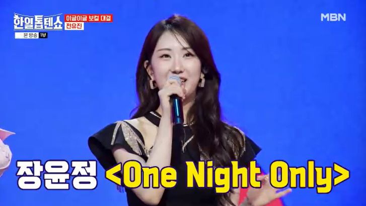 지난 1일 방송된 MBN 예능 프로그램 '한일톱텐쇼'에서는 가수 전유진이 무대에 올라 선배 장윤정의 '원 나이트 온리(One Night Only)'를 선곡해 주목받았다.