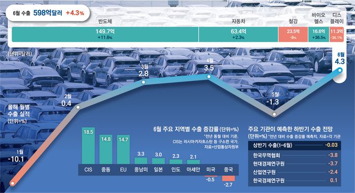 6월 전체 수출은 반도체 호황과 자동차 수출 회복에 힘입어 전년 대비 4.3% 늘어난 598억달러를 기록하며 ‘깜짝 반등’에 성공했다. 역대 6월 중 최대 수출액이다. 상반기 수출액도 역대급 실적을 기록했던 지난해와 비슷한 규모로 올라섰다.