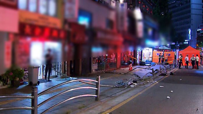 빠른 속도로 역주행하는 회색 차량이 인도 위 행인들을 그대로 덮칩니다.