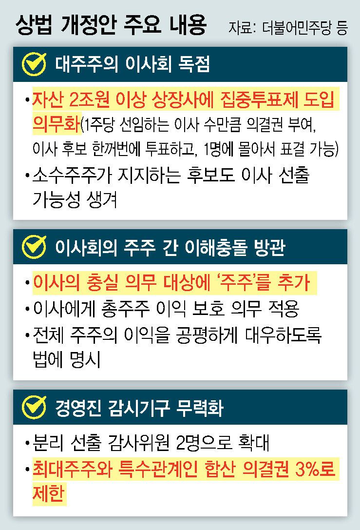 예를 들어보자. 현재 상법 개정안에서 다시 논의되고 있는 ‘집중투표제’가 있다. 이 제도는 소액주주 보호를 위한 대표적 장치다. 예컨대 어떤 주주가 1주를 가지고 있고, 이사를 3명 선임해야 한다면 모두 3표의 투표권이 생기고, 이를 한 명의 후보에게 몰아줄 수 있는 권리다. 현행 상법상으로는 기업이 정관으로 배제하지 않는 한 기본적으로 집중투표제가 적용된다. 그러나 대부분의 재벌은 정관을 통해 이를 배제하고 있다. 현재 이 제도를 실제로 운영하는 기업은 KT&G, 포스코홀딩스 등 손에 꼽을 정도다.