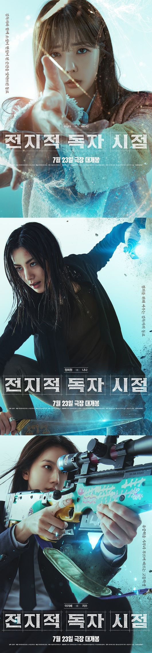 2일 영화 '전지적 독자 시점'(감독 김병우, 제공 롯데엔터테인먼트 스마일게이트, 배급 롯데엔터테인먼트, 제작 리얼라이즈픽쳐스, 공동제작 MYM엔터테인먼트 스마일게이트리얼라이즈 더프레젠트컴퍼니, 약칭 '전독시') 측은 배우 채수빈, 나나, 지수의 스틸 컷과 개인 포스터를 공개했다.
