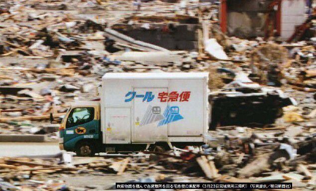 2011년 3월 대지진이 일어난 일본 미야기현 미나미산리쿠초에서 야마토 택배 운송차가 구호물자를 싣고 피난지역을 돌고 있다. 야마토택배 누리집 갈무리 |