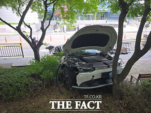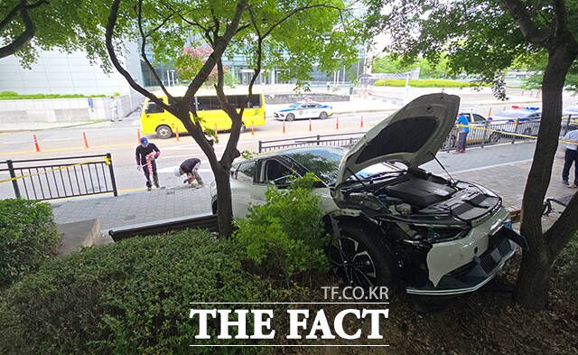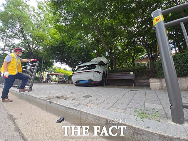 마포소방서에 따르면 1일 오후 4시 2분께 상암동의 한 건물 주차장에서 나오던 전기 승용차가 인도로 달려들어 공원 벤치에 앉아 있던 40대 남성을 덮치는 사고가 발생했다.