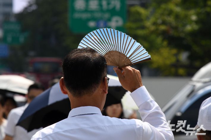 한 시민이 부채로 얼굴을 가리고 있다. 박종민 기자