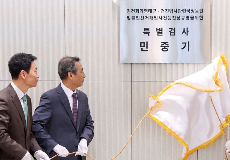 윤석열 전 대통령의 배우자 김건희 여사의 의혹을 수사하는 민중기 특별검사팀이 2일 현판식을 열고 본격적인 수사에 착수했다. 민 특검은 “모든 수사는 지나치거나 기울어지지 않게 진행할 것”이라고 했다.