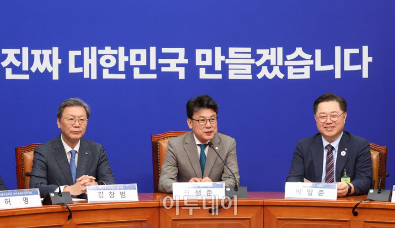 진성준 더불어민주당 정책위의장이 30일 서울 여의도 국회에서 열린 민주당-경제단체 상법 간담회에서 발언을 하고 있다. 왼쪽부터 김창범 한국경제인협회 부회장, 진 정책위의장, 박일준 대한상공회의소 부회장. 고이란 기자 photoeran@