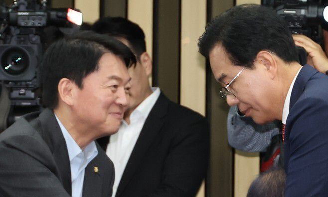 송언석 국민의힘 비상대책위원장 겸 원내대표가 지난 6월30일 서울 여의도 국회에서 열린 의원총회에 참석하며 안철수 의원과 악수하고 있다. 연합뉴스 |