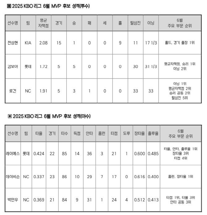 [이데일리 스타in 이석무 기자] KIA타이거즈 상승세를 이끄는 ‘믿을맨’ 전상현과 150km대 강속구가 일품인 롯데자이언츠의 ‘복덩이’ 알렉 감보아가 6월 MVP 후보에 이름을 올렸다.