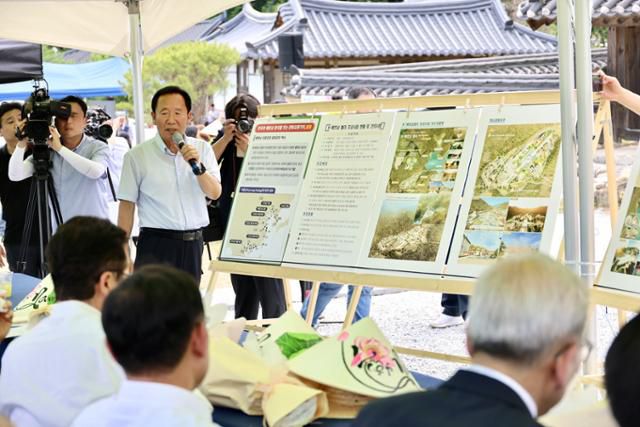 박현국 봉화군수가 지난해 K-베트남밸리조성사업지구를 방문한 문체부 장과, 주한베트남대사 등 일행에게 사업 현황을 설명하고 있다. 봉화군 제공