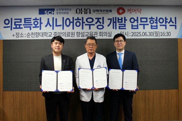 시니어 하우징은 고령자들을 위한 주거, 돌봄, 커뮤니티 기능을 종합적으로 갖춘 맞춤형 주거 형태다. 이날 협약식에는 이승후 오하자산운용 대표와 박재병 케어닥 대표, 서유성 순천향대학교 중앙의료원장을 포함한 주요 관계자가 참석했다.