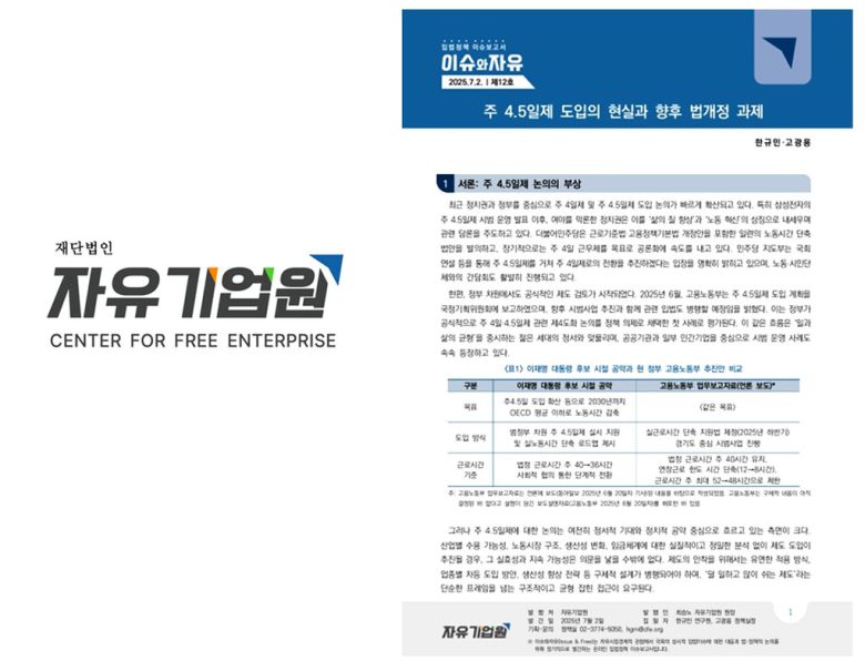 이번 보고서는 주 4.5일제 논의가 정치권 공약과 정부 계획으로 확대되고 있지만, 노동 생산성과산업별·직무별 수용 가능성 등에 대한 실증적 검토 없이 제도화가 추진되고 있다는 점에서 지속 가능성과 시장에 미칠 부작용에 대한 우려가 크다고 지적했다.