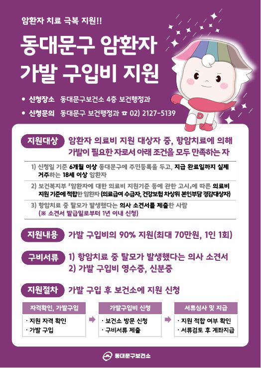 지원 금액은 가발 구입비의 90%로 최대 70만 원까지 받을 수 있다. 환자 1인당 1회 지원되며, 가발 구입 후 의사 소견서 발급일로부터 1년 이내에 구비서류를 갖춰 동대문구 보건소로 방문 신청하면 된다.
