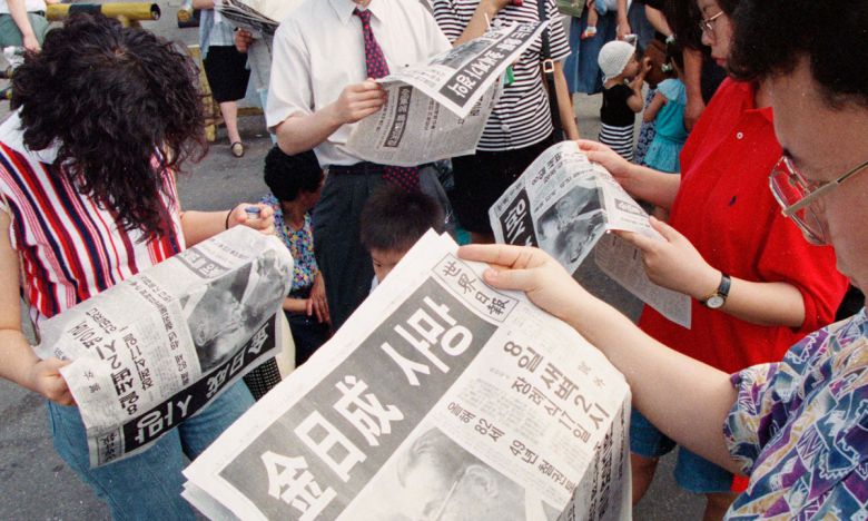 1994년 7월9일 서울역 앞 광장에서 시민들이 김일성 북한 주석의 사망을 알리는 세계일보 호외 신문을 읽고 있다. 북한 매체는 김일성 사망 후 하루가 지난 뒤에야 이를 보도했다. 세계일보 자료사진