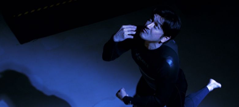 영화 <바다호랑이> 스틸컷. 고 김관홍 민간잠수사를 모티브로 한 인물 나경수(이지훈)가 전남 진도군 맹골수도에서 침몰한 세월호 선체 안을 수색하고 있다. 수중 촬영 없이 실내를 비추는 파란 조명과 배우 이지훈의 연기로 물 속을 표현했다. 영화로운형제 제공 |