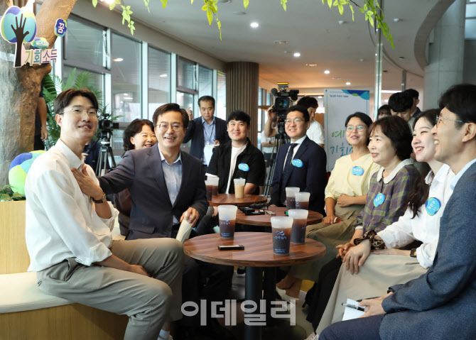 2023년 3월 경기도청 1층 로비에서 김동연 경기도지사가 예술인 기회소득 수혜자들과 만나 간담회를 하고 있다.(사진=경기도) |