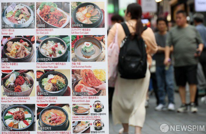 [서울=뉴스핌] 정일구 기자 = 2일 오후 서울 중구 명동거리의 한 음식점에 음식 메뉴표가 붙어 있다. 통계청이 이날 발표한 '2025년 6월 소비자물가동향'에 따르면 6월 소비자물가 지수는 전년 동월 대비 2.2% 상승했으며, 지난 1월(2.2%) 이후 5개월 만에 가장 높은 상승률을 기록했다. 특히 가공식품(4.6%)과 외식(3.1%)이 전체 물가를 각각 0.39%포인트, 0.44%포인트 끌어올렸다. 2025.07.02 mironj19@newspim.com