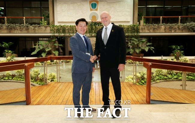 [더팩트|광명=김동선 기자] 코스타리카를 방문한 박승원 경기 광명시장이 스테판 브루너 코스타리카 제1부통령과 지난 6월 30일(현지시각) 코스타리카 대통령궁에서 면담을 갖고 지속가능발전을 위한 양국 간 지속적 협력을 제안했다.
