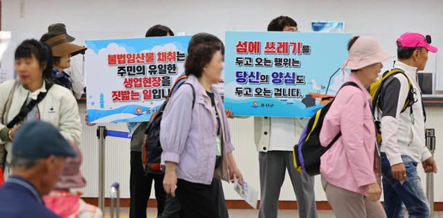 5월 27일 인천 중구 인천항 연안여객터미널에서 옹진군 직원들이 관광객들에게 쓰레기 되가져 오기와 불법 임산물 채취 금지 캠페인을 벌이고 있다. 연합뉴스 |