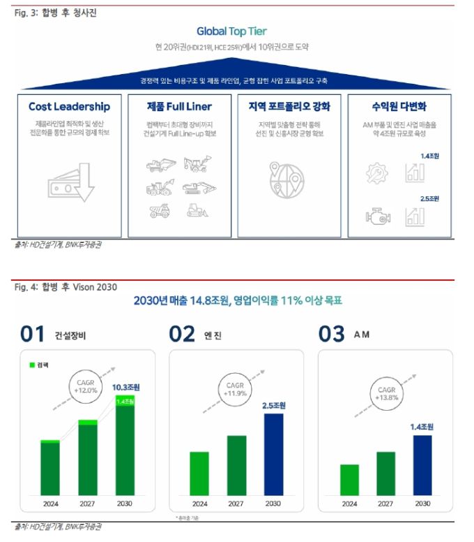 합병법인 'HD건설기계'는 건설기계 브랜드인 'HYUNDAI'와 'DEVELON'의 듀얼 브랜드 체제로, 주력 사업인 건설장비를 비롯해 엔진, AM(After Market) 등 사업 전 영역의 고른 성장을 통해 오는 2030년 글로벌 톱티어 수준인 매출 14조8000억원 이상을 달성하는 것을 목표로 한다.