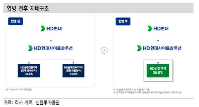 이 중 HD현대건설기계와 HD현대인프라코어를 합치며 사업비용을 절감하고 시너지는 키우며 지배구조는 심플해지는 장점이 예상된다.