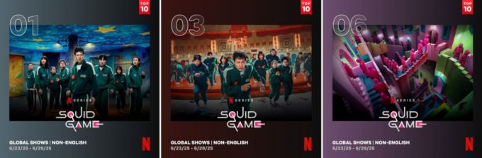 2일 넷플릭스는 지난달 27일 공개된 오징어 게임 시즌3가 3일 만에 약 6000만 시청수를 기록하며 톱10을 집계하는 93개국에서 모두 1위에 올랐다고 밝혔다. 공개 첫 주, 모든 국가에서 1위를 기록한 넷플릭스의 첫 작품으로 한국 콘텐츠 흥행 역사를 다시 썼다. 공개 첫 주 넷플릭스 역대 시리즈(비영어) 9위에 진입하며 시즌1~3가 모두 넷플릭스 역대 최고 인기 시리즈(비영어) 부문 10위권 내 이름을 올렸다.