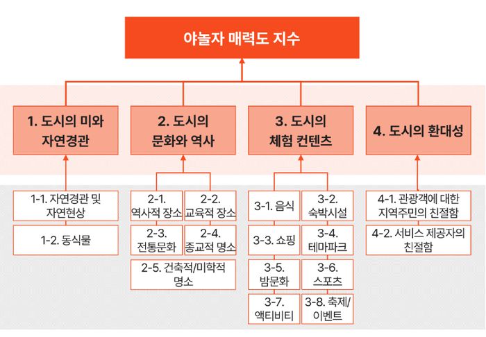 지수의 두 가지 핵심 축은 관광도시 매력(Attractiveness)과 관광도시 인기(Reputation)로 나뉜다. 매력은 소설미디어에 드러난 감성 분석을 통해, 인기는 얼마나 널리 알려지고 주목받는지를 SNS상의 언급량(buzz)으로 측정했다. 두 축을 기반으로 도시의 매력도를 △도시의 미와 자연경관 △도시의 문화와 역사 △도시의 체험 콘텐츠 △도시의 환대성 등 4개 핵심 차원(Dimension)으로 세분화했다.