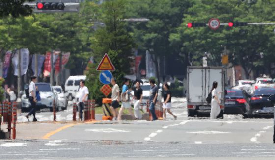 2일 부산광역시 해운대구의 한 도로에서 아지랑이가 피어오르고 있다. 송봉근 기자 |