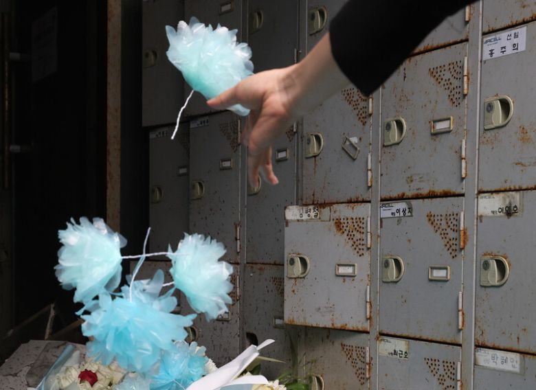 ‘아리셀 참사’ 1주기인 지난달 24일 오전 유족들이 경기 화성시 서신면 아리셀 공장 문을 열었다. 참사 이후 처음이었다. 안전 때문에 아무도 안으로 들어갈 수는 없었다. 대신 공장 안으로 파란 종이꽃을 던져서 보고픈 이들의 넋을 달랬다. 그 너머 사물함에 붙은 직원들의 이름표가 보였다. 이름표들이 검게 그을리고 녹슬고 닳았다. 1년이 지나도록 아무도 처벌받지 않아 타들어 가는 유족의 마음과 같아 보였다.